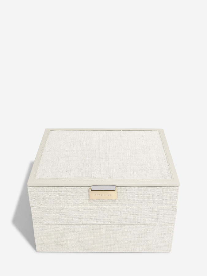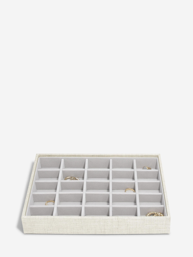 Šperkovnica obsahuje vrchný uzatvárateľný top box, box s 25 priehradkami a hlboký box s 3 priehradkami, ktorý si môžete doplniť vkladacím boxom na prstene, alebo vankúšikom na náramky a hodinky.